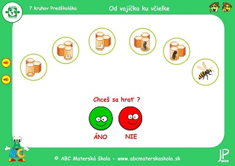 1.HRA USB Včielka - Časová postupnosť - Od vajíčka ku včielke –  Klikaj na obrázky a skús si zapamätať, ako sa liahne včielka. Vlož obrázky v správnom poradí v smere šípok od vajíčka ku včielke. Zopakuj v správnej postupnosti, koľko dní sa liahne včielka.
