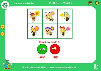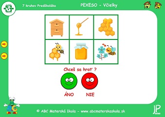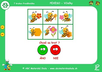 10.- 12. HRA USB Včielka – Pexeso Včielky – Prezri si všetky kartičky a porozprávaj, čo vidíš na obrázkoch. Klikaj na kartičky a hľadaj rovnaké obrázky. Nájdi rovnaké kartičky a urči ich polohu a poradie v každom riadku.