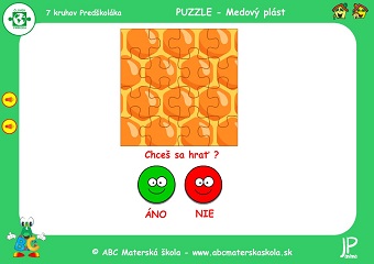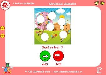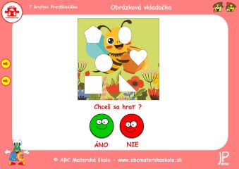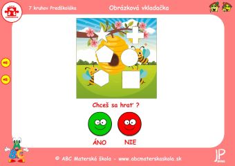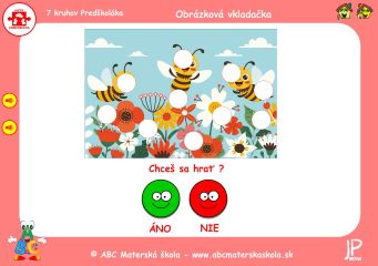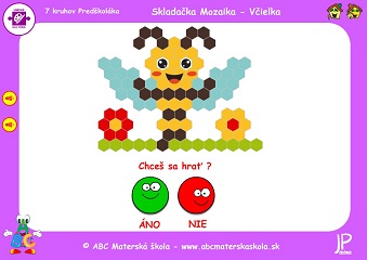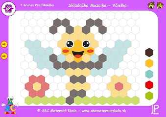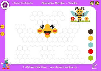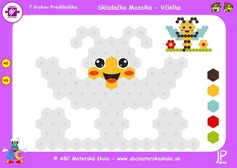 5.- 9. HRA USB Včielka – Mozaika Včielka –  Pomenuj obrázok a urči všetky farby na obrázku. Vkladaj dieliky do políčok na rovnaké farebné bodky (farebné políčka, podľa obrysu podľa predlohy alebo podľa pokynov). Prezri si obrázok a urči, ktorých farebných dielikov je najviac, najmenej alebo rovnako.