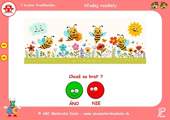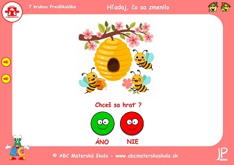 2. HRA USB Včielka - Hľadaj, čo sa zmenilo – Porozprávaj, čo vidíš na obrázku. Hľadaj a pomenuj 6 rozdielov na obrázkoch. Označ krúžkom, čo sa zmenilo na obrázku vpravo.