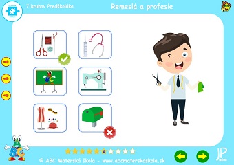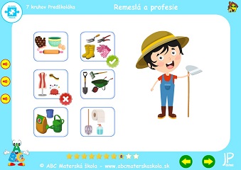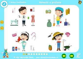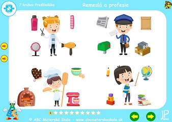 Súbor hier Remeslá a profesie – 1. až 10. hra – Porozprávaj, kto je na obrázku a čo drží v ruke. Klikaj postupne na obrázky povolaní a pomenuj predmety, s ktorými každý pracuje. Porozprávaj, čo kto robí a kde pracuje. Hľadaj a vyber pomôcky, ktoré používajú pri svojej práci. Pomenuj ostatné predmety a skús porozmýšľať, kto ich používa pri svojej práci.