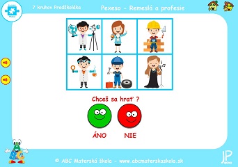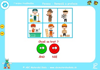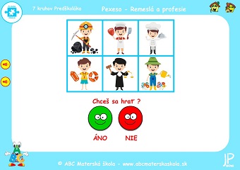 Hry PEXESO Remeslá a profesie – 11. až 18. hra – Pomenuj povolania a skús si ich zapamätať. Klikaj na kartičky a hľadaj rovnaké obrázky. Porozprávaj, čo kto robí a čo potrebuje pri svojej práci.