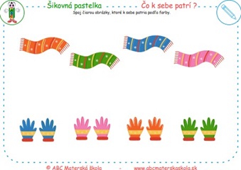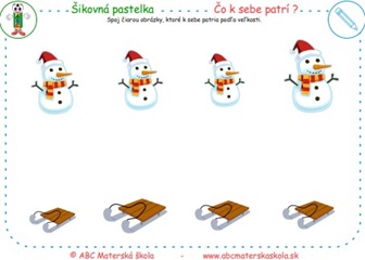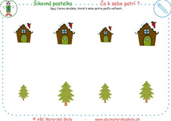 Spoj čiarou obrázky, ktoré k sebe patria podľa farby alebo podľa veľkosti.