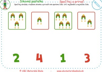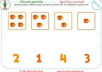 Spočítaj obrázky v každom riadku a priraď k nim správne číslo. Urči najmenšie a najväčšie číslo.