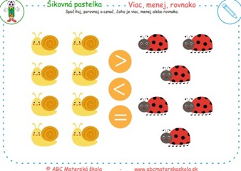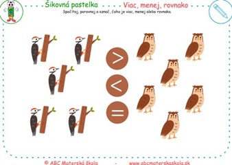 Spočítaj, porovnaj a označ, čoho je viac, menej alebo rovnako.