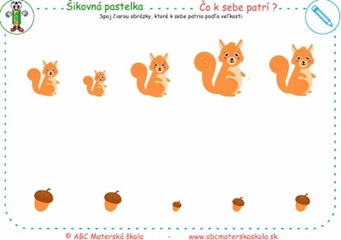 Spoj čiarou obrázky, ktoré k sebe patria podľa veľkosti. Zakrúžkuj najmenší a najväčší obrázok.