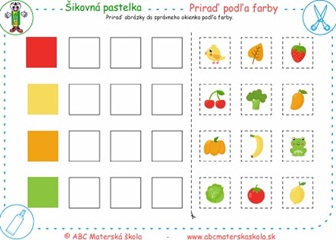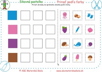 Priraď obrázky do správneho okienka podľa farby. Pomenuj všetky farby.